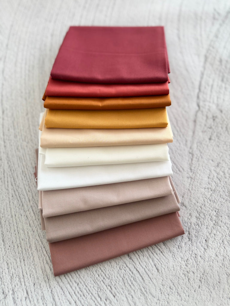 This thoughtfully curated bundle Snowflake (one of a kind) bundle of 10 coordinating solids fat quarters may include fabrics from designers such as Art Gallery Fabrics, Devonstone, Bella and Kona.