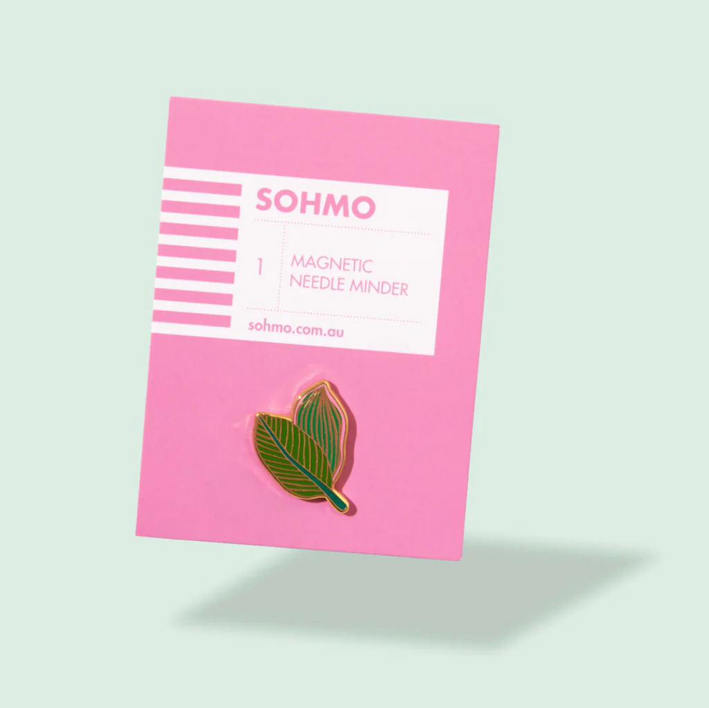 The SOHMO Magnetic Needle Minder is both practical and beautiful, keeping your needle secure and close at hand while you work. Crafted from enamelled metal, this design features two lush green leaves with fine gold veining - a little reminder of the tropics while you sew.